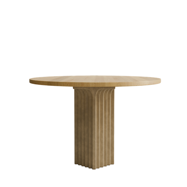 Der Esstisch Arc ist vom inspiriert von und übersetzt architektonische Details in minimalistische Möbelformen mit Stufen und Bögen, die Tiefe und Schatten erzeugen. Die Serie ist als rechteckiger Tisch mit 250 cm und runder Tisch mit 120 cm erhältlich und eignet sich sowohl für große als auch für gemütliche Essbereiche. Die Tischplatte besteht aus massiver Eiche mit tiefem Kaffeeschwarzlack, während der architektonische Lampensockel aus Fasergussbeton besteht und in einem passenden Farbton handbemalt ist. Der Tisch passt perfekt zu den Esszimmerstühlen Brutus und funktioniert auch mit den Esszimmerstühlen Nama oder Hiro. Er besteht aus zwei Teilen, Platte und Lampensockel, die sich einfach mit verdeckten Schrauben zusammenbauen lassen. Der Esstisch Arc kombiniert skulpturale Präsenz mit zeitloser Eleganz. Entworfen von Kristian Sofus Hansen und Tommy Hyldahl.