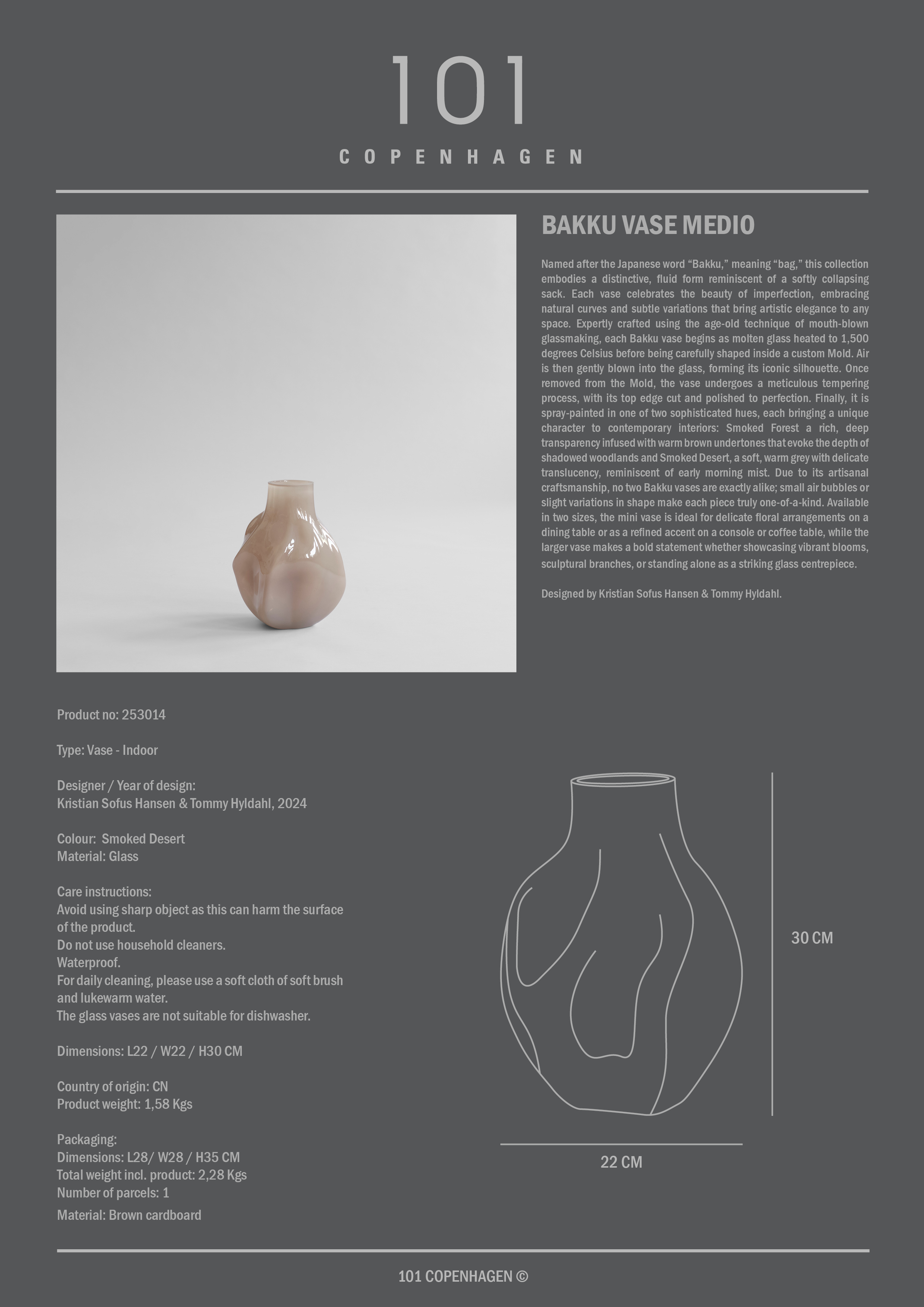 Bakku bedeutet auf Japanisch Tasche und hat eine weiche, organische Form, die an einen zusammenfaltbaren Sack erinnert. Jede Vase besteht aus mundgeblasenem Glas, das in einer speziell angefertigten Form geformt wurde. Anschließend wird der Rand geschnitten und poliert. Schließlich wird sie in den tiefen Brauntönen "Smoke Forest" oder in einem hellen, warmen grau"Smoke Desert" besprüht. Da jede Vase handgefertigt ist, variiert ihre Form und kann kleine Luftblasen aufweisen, was jede Vase zu einem Unikat macht. Die Serie ist in zwei Größen erhältlich, wobei die klein für Blumen auf dem Tisch oder als elegantes Detail geeignet ist und die große allein stehen oder als auffälliges Tafelaufsatz Zweige und Blumen hervorheben kann. Entworfen von Kristian Sofus Hansen und Tommy Hyldahl.