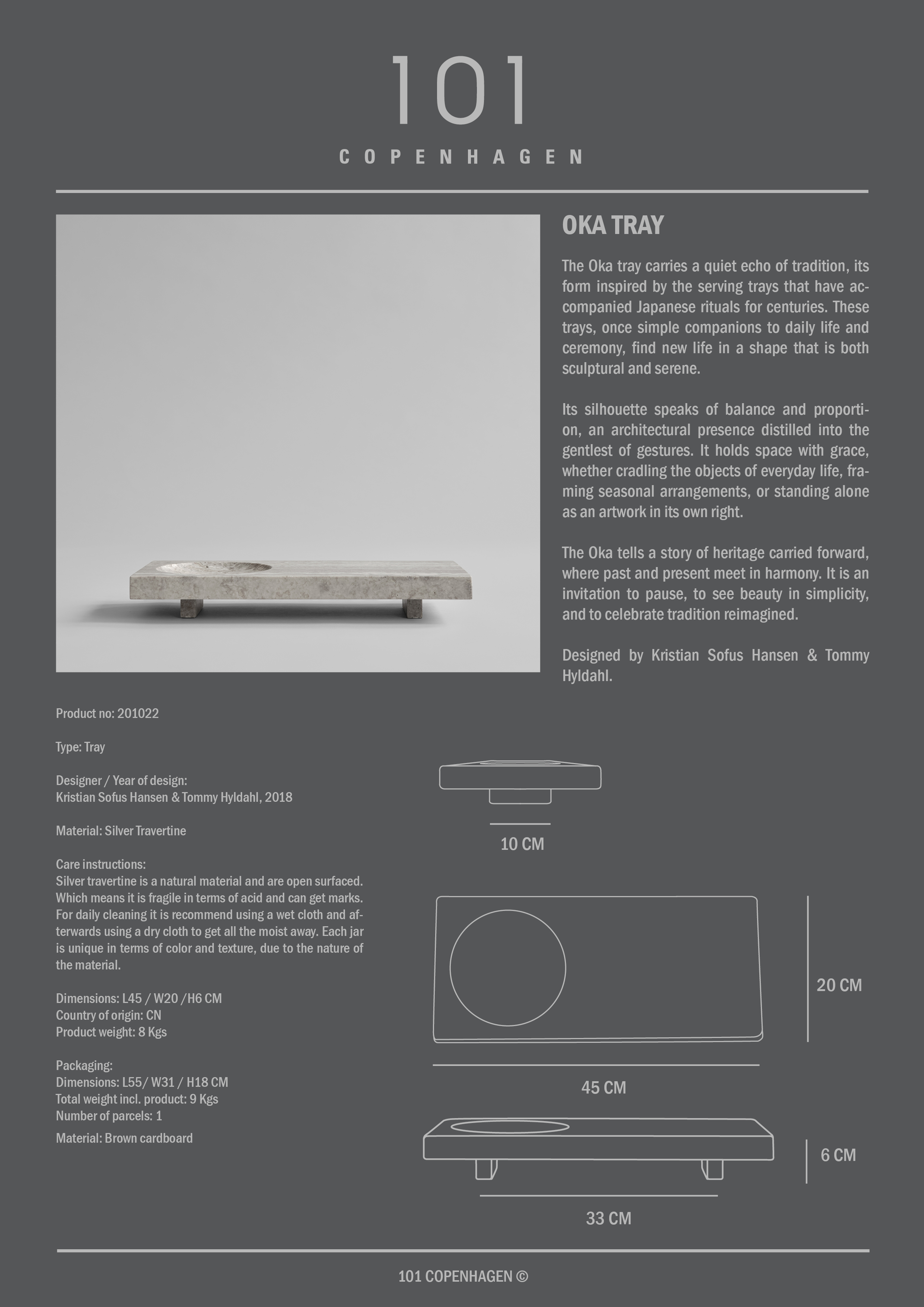 Das Oka-Tablett trägt einen leisen Widerhall der Tradition in sich. Seine Form ist inspiriert von den Serviertabletts, die japanische Rituale seit Jahrhunderten begleiten. Einst schlichte Begleiter des Alltags und von Zeremonien, finden diese Tabletts in einer skulpturalen und zugleich ruhigen Form neues Leben. Seine Silhouette zeugt von Ausgewogenheit und Proportion, von einer architektonischen Präsenz, die sich in sanftesten Gesten verdichtet. Es füllt den Raum mit Anmut, ob es nun Alltagsgegenstände birgt, saisonale Arrangements einrahmt oder als eigenständiges Kunstwerk steht. Das Oka erzählt eine Geschichte von weitergegebenem Erbe, in der Vergangenheit und Gegenwart harmonisch zusammenfinden. Es lädt dazu ein, innezuhalten, die Schönheit der Einfachheit zu entdecken und neu interpretierte Tradition zu feiern.