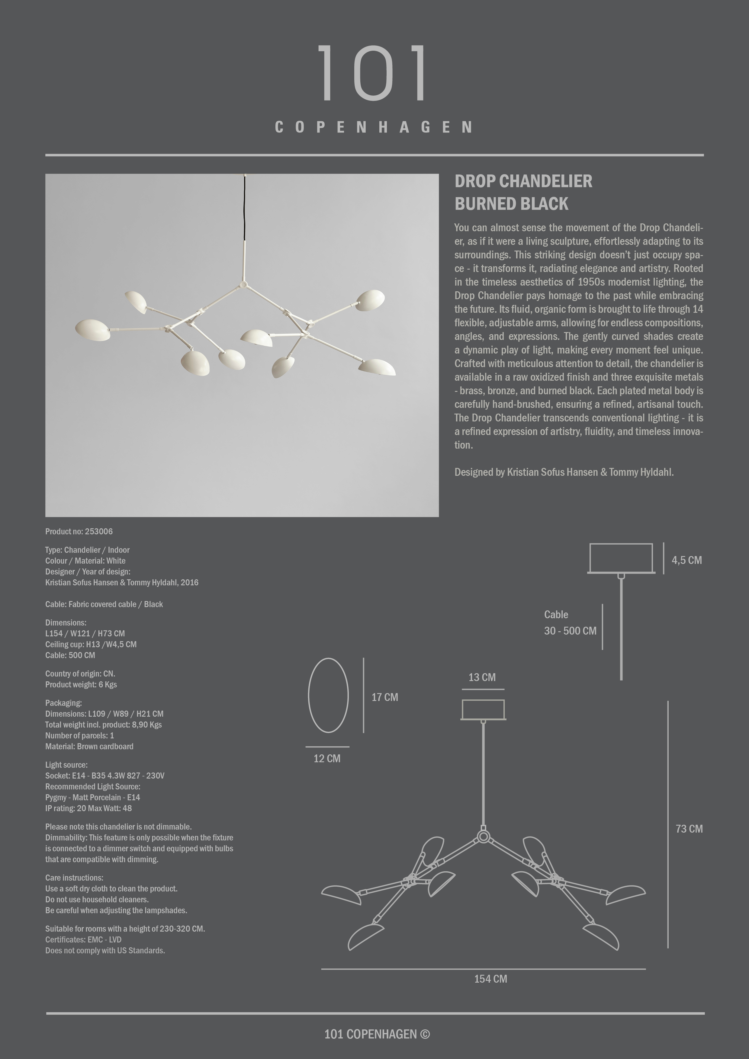 Der Drop Chandelier ist wie eine lebende Skulptur, die sich ihrer Umgebung anpasst und einen eleganten und künstlerischen Ausdruck erzeugt. Inspiriert von der modernistischen Beleuchtung der 1950er Jahre vereint er Vergangenheit und Gegenwart in einem organischen Design mit 14 flexiblen Armen, die in unzählige Richtungen verstellt werden können. Die geschwungenen Lampenschirme sorgen für ein lebendiges Licht, das die Stimmung im Raum verändert. Die Lampe ist in roh oxidierter Ausführung sowie in Messing, bronze, gebranntem Schwarz und weiß erhältlich, alle handgebürstet für einen raffinierten Ausdruck. Der Drop Chandelier ist mehr als eine Lampe, er ist zeitlose Innovation und künstlerisches Design. Entworfen von Kristian Sofus Hansen und Tommy Hyldahl.