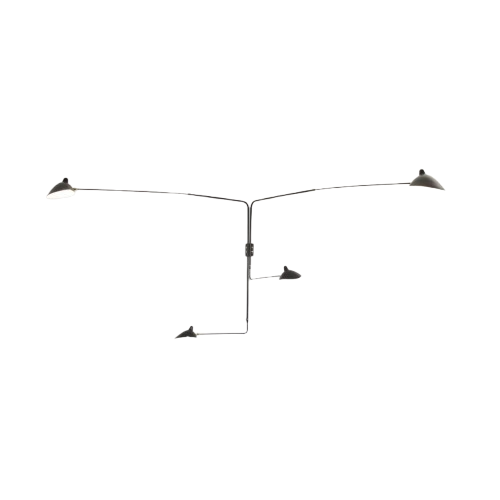 Die vierarmige Wandlampe von 1954 ist ein ikonisches Designobjekt, das Funktionalität und anspruchsvolle Ästhetik vereint. Die Leuchte ist auf einer rechteckigen Platte an der Wand montiert und verfügt über vier verstellbare Arme, die aus einem zentralen Rohr hervorgehen und jeweils mit einem eleganten Reflektor versehen sind. Die Kombination aus Stahl-, aluminium und Messingdetails erzeugt einen raffinierten Ausdruck, wobei der Kontrast der Materialien in schwarz oder weiß hervorgehoben wird. Eine zeitlose Wahl, die jedem Raum Charakter, Flexibilität und klassisches Design verleiht.