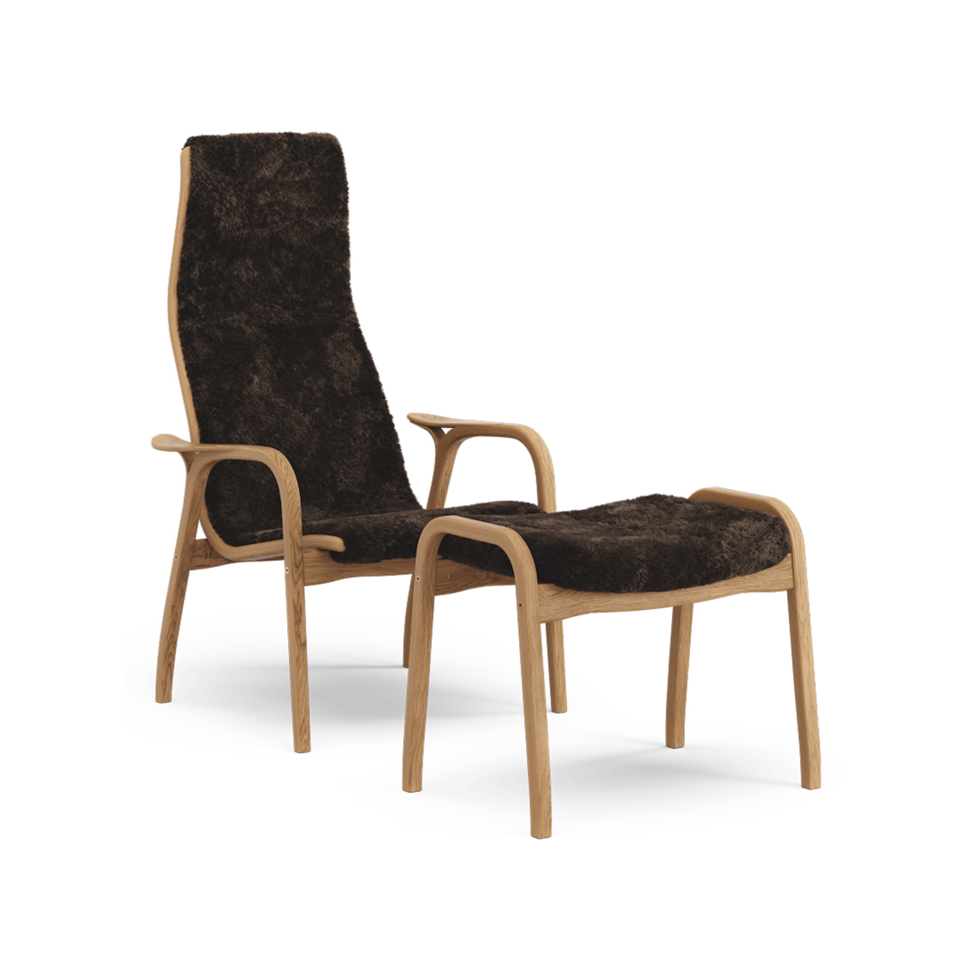 Swedese Lamino Sessel mit Fußhocker hoch, geölte Eiche/Espresso/Schaffell